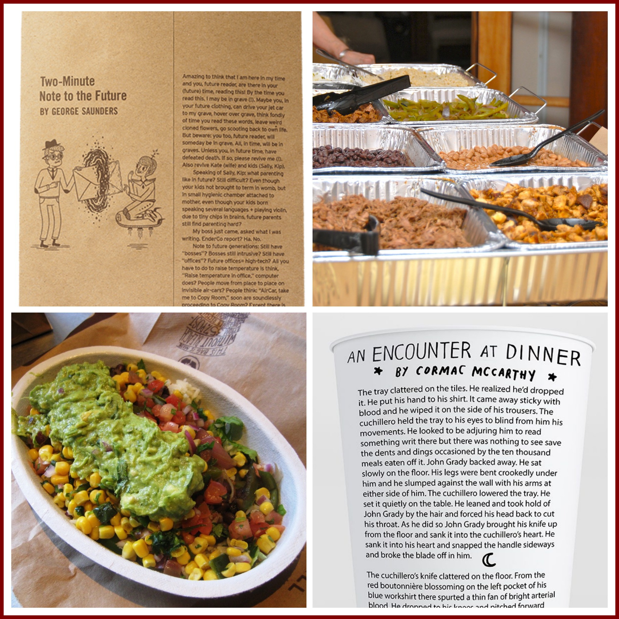 Is it just me, or is it impossible to open a newspaper these days without reading about Chipotle? I know they’ve had a few setbacks lately — there was that whole executive excessive salary issue last week; and then last month when they decided to print inspirational quotes from the country’s literary lights on takeout bags and cups and didn’t include any Latino voices in there…well, that was not the best thing ever. But there’s no question they’re shaking things up a bit and challenging the status quo –I mean, think how crazy it is that your adobo-marinated chicken tacos come with a side Cormac McCarthy or George Saunders reading? And how about that whole “Farmed and Dangerous” series they did for Hulu earlier this year — the four-part mini series eviscerating industrial agriculture? (“It’s not about product integration it’s about values integration,” said the campaign’s producer.) It’s also no small thing that whenever we finish a soccer game out in Jersey or Long Island, the first thing my kids ask me to do from shotgun is launch my chipotle app and find the closest location, so we can celebrate their victories (or soothe their defeats) with a big-a$$ burrito bowl. In other words, I’m willing to give Chipotle a pass on their most recent troubles. I’m also crossing my fingers that no one posts a link in the comment field telling me they’re hiring two-year-olds in Bangladesh to do their sustainable farming or something like that.