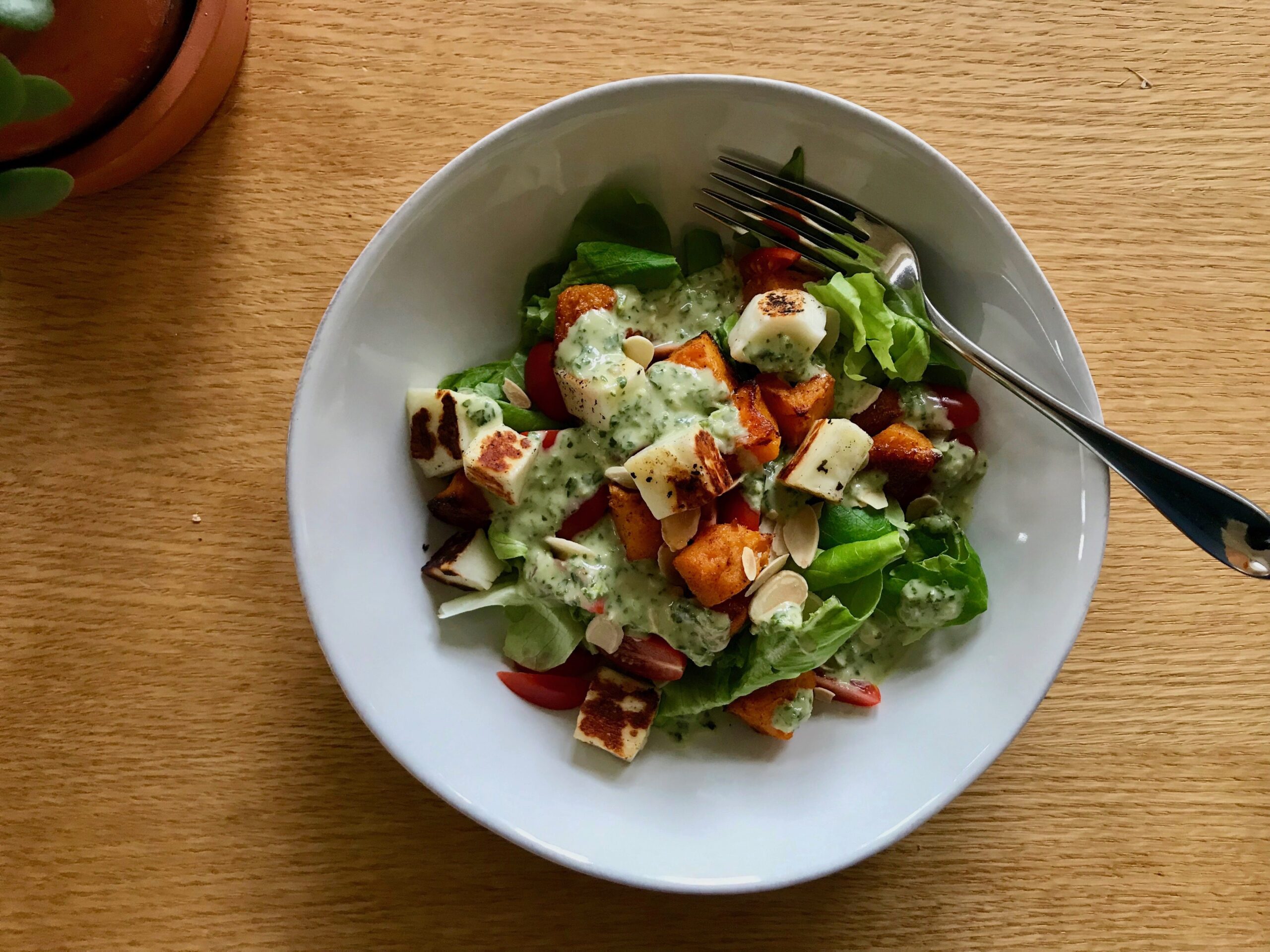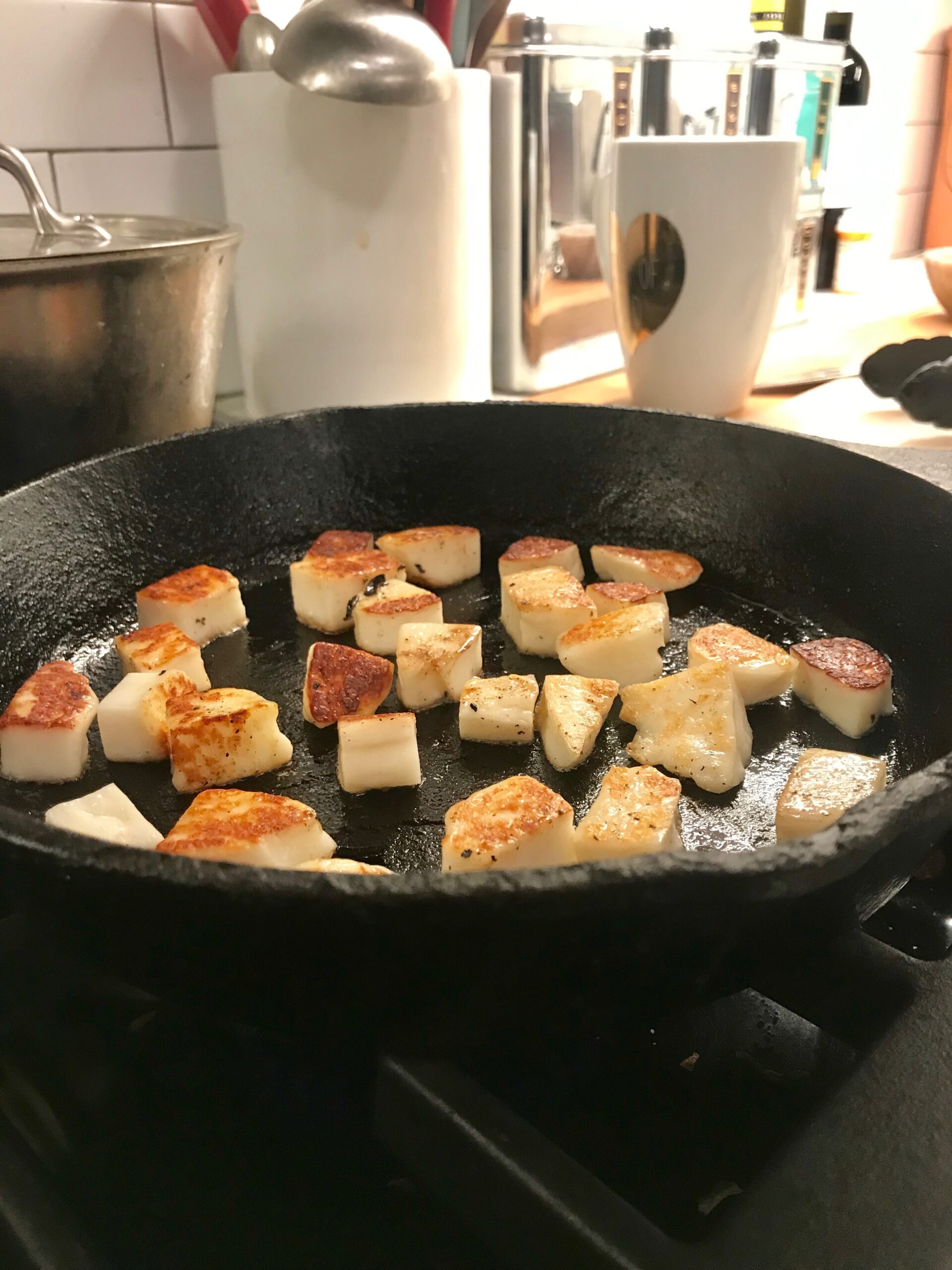 …1. Halloumi! It’s cheese, so it’s not exactly good for you, but if you cut it into cubes, then fry it for a few seconds in a cast-iron pan (or a very lightly greased skillet) it’s just enough of a substantive hit that upgrades in a regular old salad (above, paired with butternut squash, almonds, an herby-yogurt dressing I’m completely blanking on) or a dutifully green Buddha bowl. (Recipe for that one coming soon.) Look for halloumi in better supermarkets near the feta and cotija.