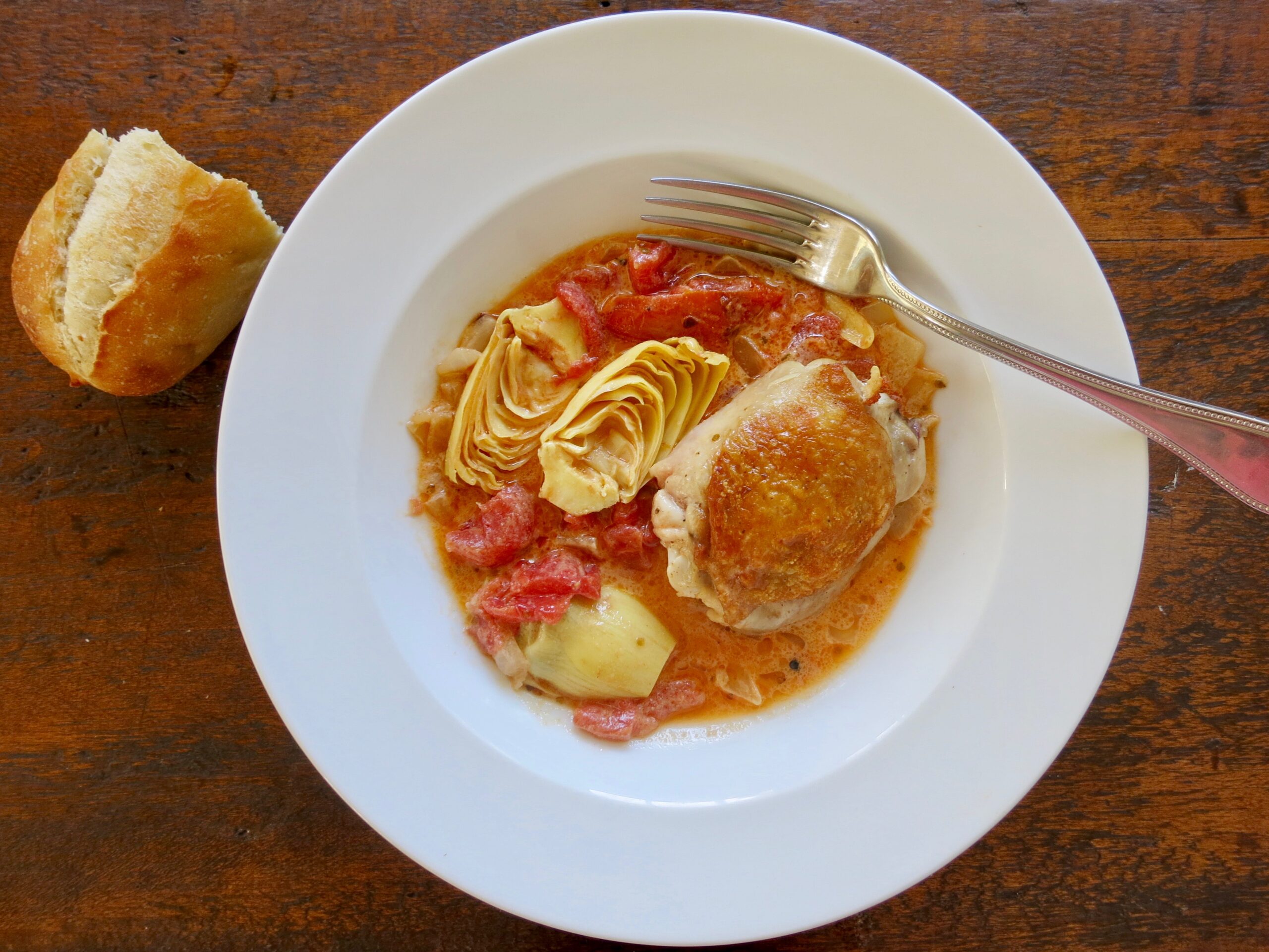 -Chicken with Artichokes in Creamy Mustard Sauce (above) p. 90 of Dinner: The Playbook and also here. I use boneless, skinless thighs and everyone is happy.