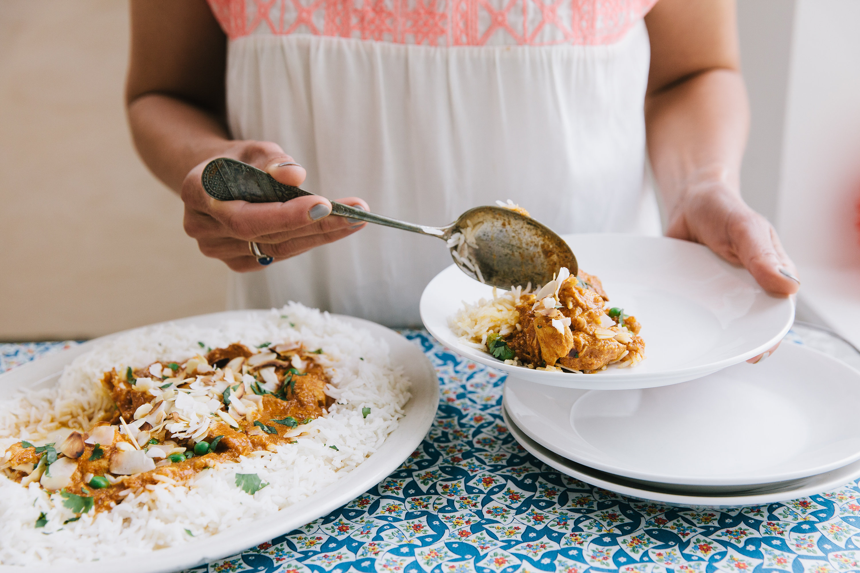 Today I’m sharing my favorite spring slow cooker dinner — Indian Butter Chicken. The recipe calls for sweet peas but you can use almost any fast cooking or precooked vegetable from baby spinach to blanched cauliflower or broccoli (you stir the veggies in right at the end to warm through). I top our Slow Cooker Indian Butter Chicken with large flake coconut, almonds, and cilantro. That said, I encourage you to look in the pantry and use this meal as an excuse to take care of any little bits of nuts, seeds, or fresh herbs floating around. Pantry clean out and dinner rolled into one. Score.
