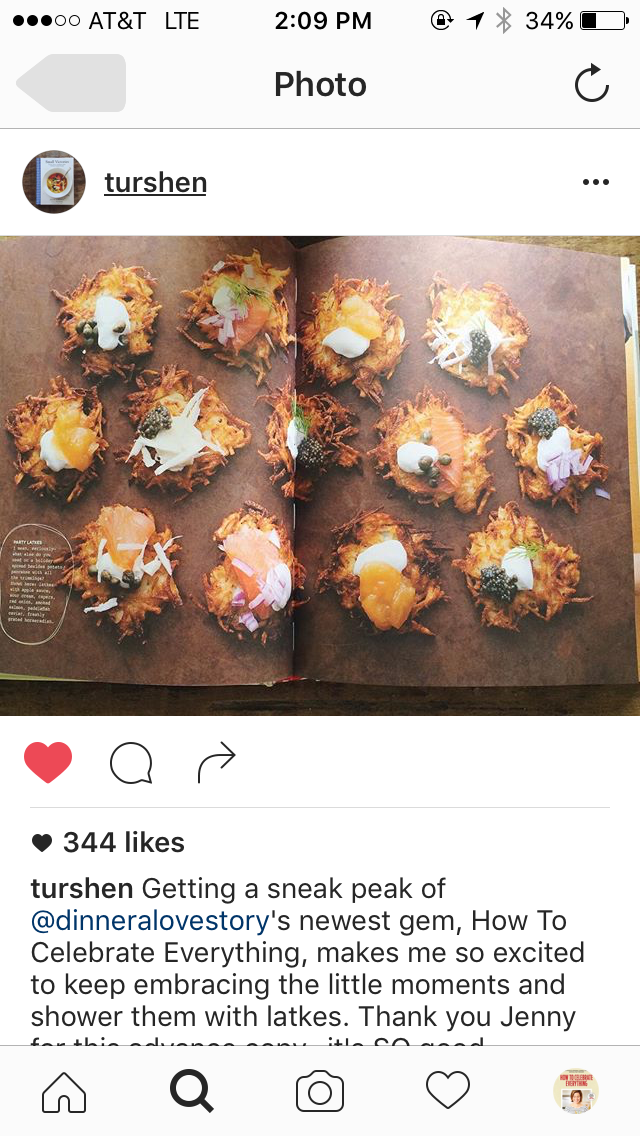 I love that Julia Turshen chimed in with the Latke Fixins photo, a full three months before Hanukkah. (I could eat them every night. Maybe I will and I’ll just call them hash browns.)