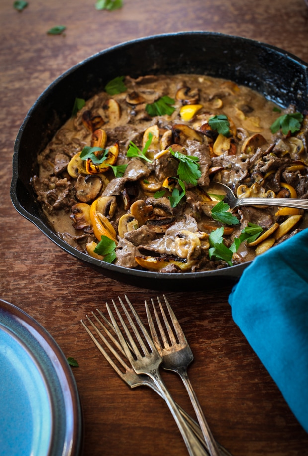 Since this dish is partially prepped in advance (beef sliced, mushrooms chopped, parsley washed) it could be a great week-night option. The egg noodles cook up in a snap or they could be cooked ahead of time and stirred right into the sauce just before serving.