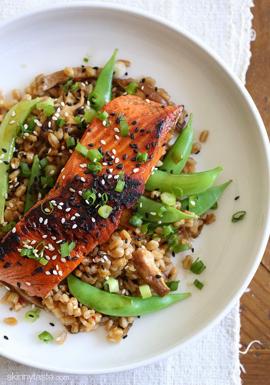 Farro, shiitake mushrooms, and snap peas are sauteed with ginger, garlic and spices and served with wild salmon marinated with honey, lemon and soy sauce. Not only is this dish absolutely delicious, it's also high in protein, omega-3's and is ready in about 30 minutes.