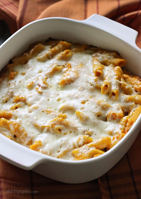 Whole wheat pasta baked in the oven with a quick pumpkin sauce