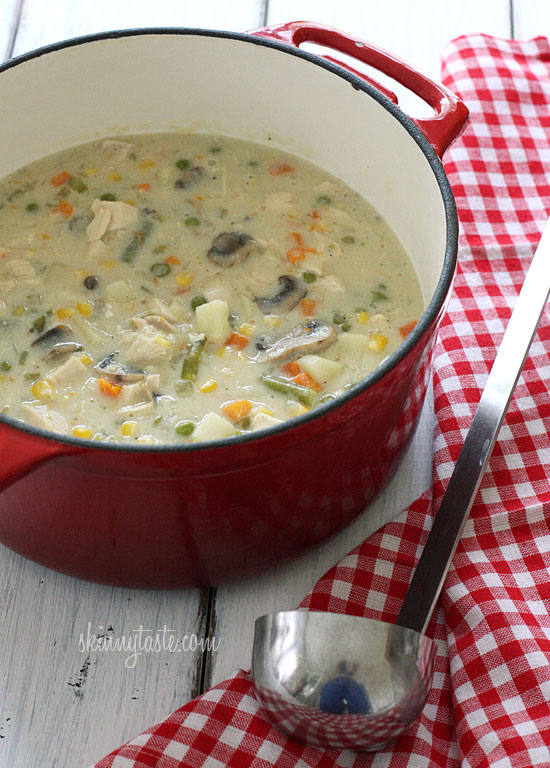 Chicken pot pie is ultimate comfort food and this creamy, chunky soup is loaded with chicken, potatoes, mushrooms, peas, carrots, corn, celery, onions and green beans in every bite. You can modify this with the vegetables you like to suit your taste. If you want to get fancy, you can serve this in hollowed out bread bowls or serve it with cut-out baked pie crust (extra points), but I often make them with these Easy Garlic Cheddar Biscuits.
