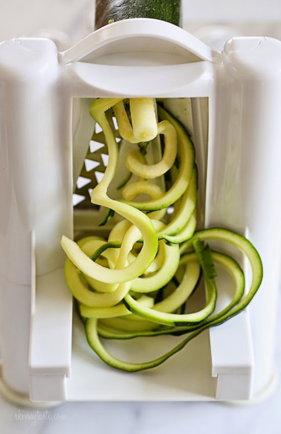 I've been using the thicker blade on my Paderno Spiral Vegetable Slicer to make my zoodles (zucchini noodles). I like the larger noodle because it has more of bite and I'm careful not to overcook them so they don't get soggy. Under two minutes is all they need, then I quickly remove them from the hot skillet or they will keep cooking.