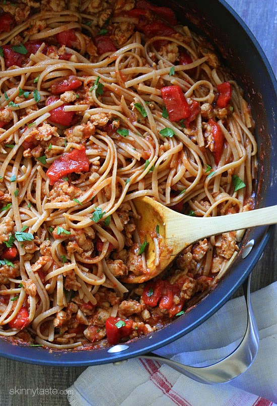 Spicy Whole Wheat Linguini with Sausage and Roasted Peppers