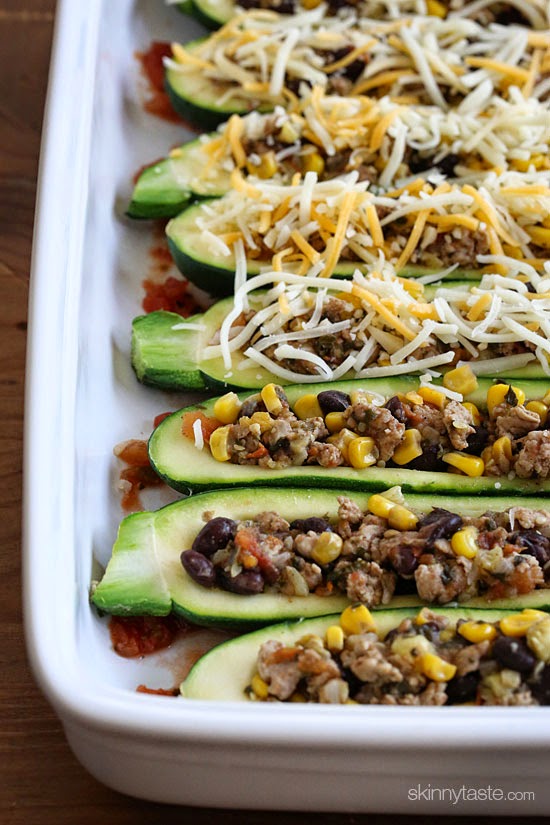 Reviving this from the archives since I have tons of zucchini! This recipe was inspired by my Sante Fe Turkey Stuffed Peppers which worked wonderful as a filling for these zucchini boats! If you're like me and have so much zucchini you don't know what to do with it, check out 35 Skinnytaste Zucchini recipes which includes a few other stuffed zucchini boat varieties.